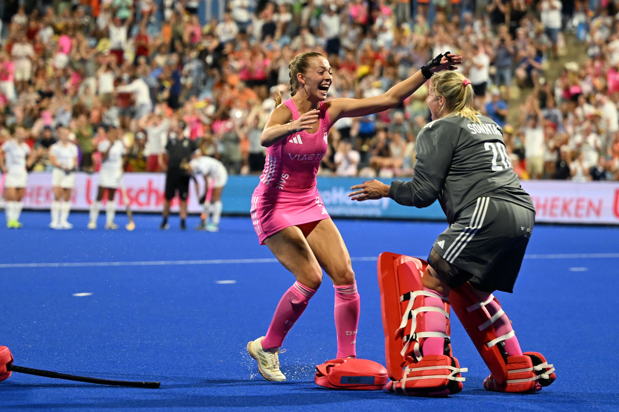 «Das Ding nach so einem Fight zu gewinnen, das ist einfach ein geiles Gefühl», sagte die Zahnärztin aus Mönchengladbach. Einen Versuch hatte sie abgewehrt, einer war ungültig, weil die Schützin mit der falschen Schlägerseite traf, und beim letzten Versuch wehrte Sonntag erst ab und dann traf Delphine Marien doch noch ins Tor – aber das Zeitfenster von acht Sekunden war um eine Zehntelsekunde überschritten. Das musste überprüft werden, im Stadion war es plötzlich total still. Dann folgte ein Aufschrei und es gab kein Halten mehr. «Es ist der Wahnsinn», jubelte Julia Sonntag.